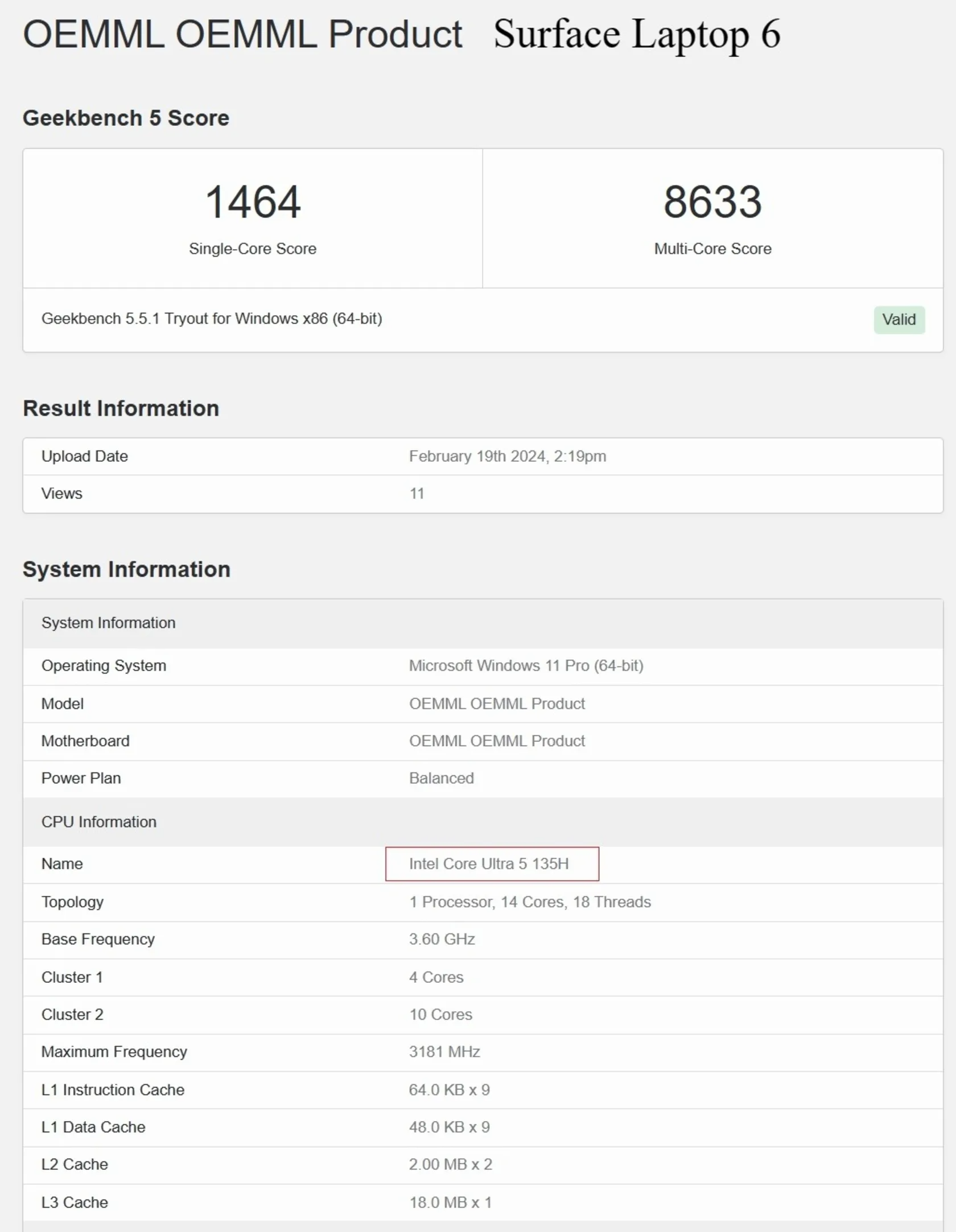 سرفیس لپ‌تاپ ۶ که با نام OEMML وارد دیتابیس گیک‌بنچ ۵ شده است، در بخش تک‌هسته‌ای و چندهسته‌ای توانست به‌ترتیب امتیاز ۱٬۴۶۴ و ۸٬۶۳۳ کسب کند.